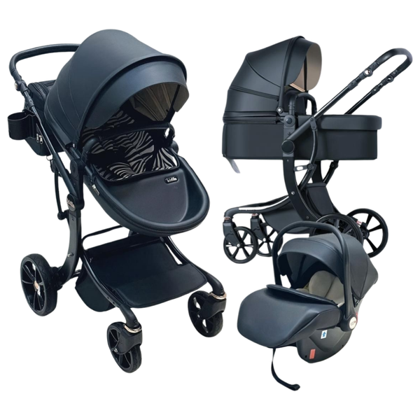 تتميز بهيكل رباعي العجلات بعجلات من EVA ومطاط بقطر 31 سم، ونظام تعليق متعدد المستويات، ومقبض والدين قابل للتعديل لراحة الدفع. يشمل النظام مهد ومقعد مع مرتبة، ومظلّة، وحاجب للشمس، وسلة تسوق، وهيكل مقعد/سرير محمول مع غطاء. الأبعاد الخارجية 150 × 75 × 45 سم، والحجم المطوي 75 × 50 سم