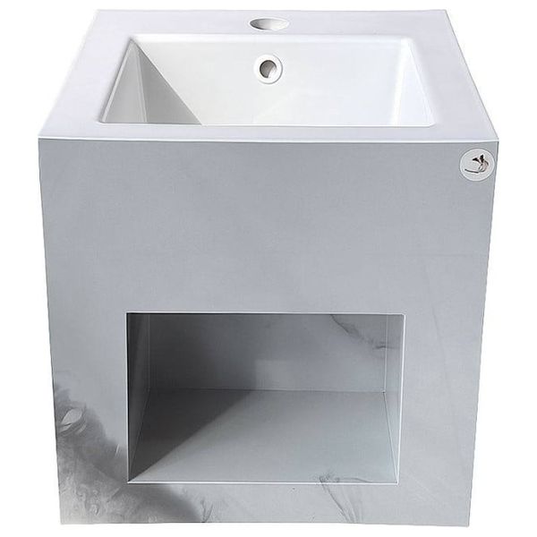 مغسلة بورسلين مكعبية بتصميم حديث ومظهر رخامي رمادي فاتح، بقياس 40×40 سم. الحوض المربع يوفر مساحة عملية حتى في الحمامات الصغيرة، ويأتي مع مرآة LED دائرية بثلاث درجات لونية (أبيض، دافئ، نهاري) وهوتر حراري مضاد للبخار للحفاظ على رؤية واضحة بعد الاستحمام