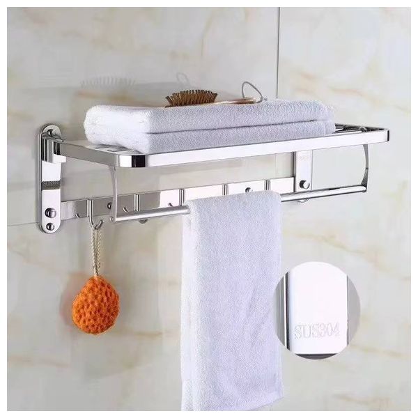 حامل مناشف جداري مع رف علوي وخطافات من لازورد لتنظيم الحمام بشكل فعال. مصنوع من معدن متين مقاوم للرطوبة والصدأ. يحتوي على رف علوي للمناشف المطوية أو المستلزمات، وقضيب للمناشف وخطافات جانبية للإكسسوارات والليفة