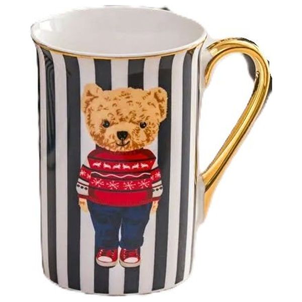 كوب كرسمس من سيراميك عالي الجودة ويحتوي على تصميم دب احتفالي على خلفية مخططة ومقبض ذهبي لامع