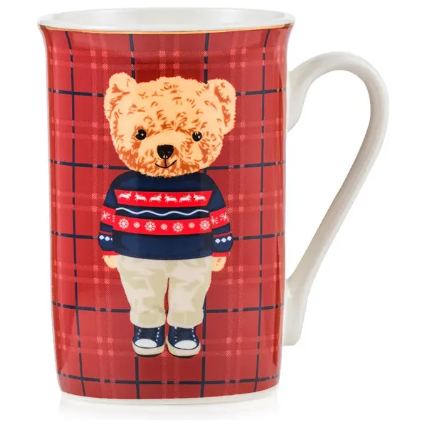 كوب أحمر بتصميم دبدوب مرح على خلفية بنقشة مربعات