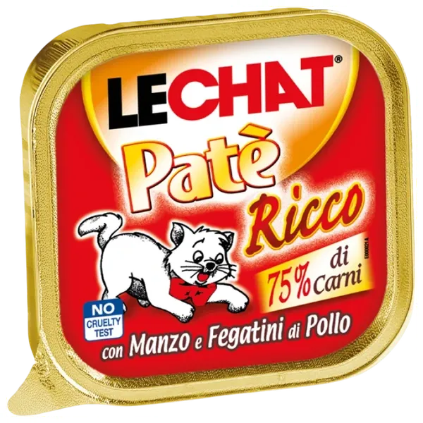 طعام كامل للقطط البالغة يحتوي على نسبة عالية من اللحوم، باتيه كريمي مطهو على البخار غني بفيتامينات A-D3-E لرفاهية الحيوان. بدون ألوان أو مواد حافظة. بدون اختبارات قسوة. المكونات: اللحوم ومشتقاتها 75% (لحم بقري طازج 9%، أكباد دجاج طازجة 6%)، مواد معدنية. المضافات الغذائية: فيتامين أ 2500 وحدة/كجم؛ فيتامين د3 250 وحدة/كجم؛ فيتامين هـ 10 مجم/كجم. المكونات التحليلية: البروتين الخام 8%؛ الدهون الخام 7.5%؛ الألياف 0.3%؛ الرماد 1.5%؛ الرطوبة 81%