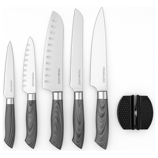 | محتويات المجموعة | سكين الشيف 19 سم؛ سكين الخبز 20 سم؛ سكين سانتوكو 16 سم؛ سكين عالمي 12 سم؛ سكين مسنن عالمي 12 سم؛ مبراة احترافية |