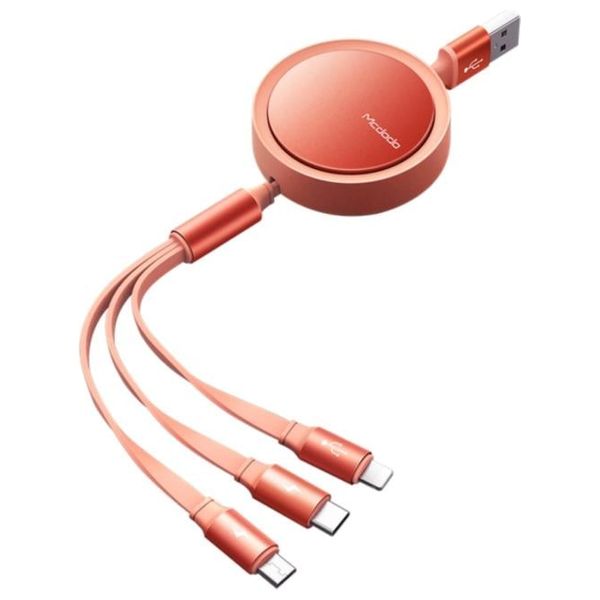 كابل Mcdodo 3 في 1 هو حل عملي وموفر للمساحة، حيث يوفر منافذ USB-C و Lightning و Micro USB من طرف واحد موصول بمنفذ USB-A قياسي. يبلغ طول الكابل 1.2 متر، ويدعم الشحن ومزامنة البيانات عبر موصلات Lightning و Micro USB بسرعة $5V/2A$، ويدعم شحن Type-C بسرعة $5V/3A$. يصل إجمالي التيار إلى 3.5 أمبير كحد أقصى للشحن المتعدد الفعال.