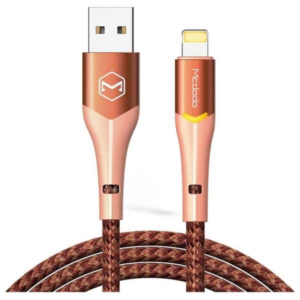 كابل Mcdodo USB-A إلى Lightning مصمم ببناء متين من نسيج مقوّى وموصلات معزَّزة ومؤشر LED ذكي يتغير لعرض حالة الشحن. متوافق مع أجهزة iPhone وiPad لنقل البيانات بشكل مستقر وشحن سريع. طوله 1.6 متر لتوفير مرونة .