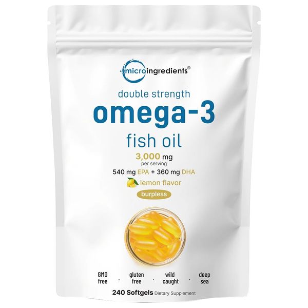 يوفر زيت السمك أوميغا-3 3000 ملغ لكل جرعة في 240 كبسولة هلامية بنكهة الليمون (لا تسبب التجشؤ). تحتوي كل جرعة على 540 ملغ من EPA و360 ملغ من DHA من زيت سمك أعماق البحار