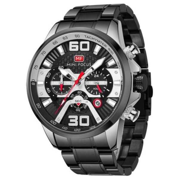 كلكشن رياضي شكل دائري هيكل من الفولاذ المقاوم للصدأ مقاس 48 ملم الزجاج معدني لون المينا أسود حركة كوارتز كرونوغراف سوار من الفولاذ المقاوم للصدأ باللون الأسود بمادة PVD مقاس 24 مم مقاومة الماء 3 بار ساعة رجالية