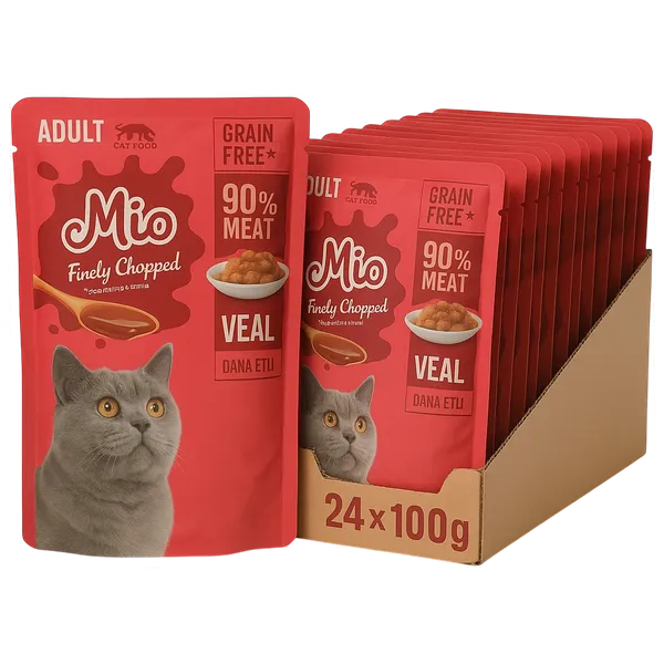 المنتج يحتوي على لحوم ومنتجاتها بقري 5٪، حبوب ومعادن، مع إضافات تكنولوجية مثل عوامل الهلام والمكثفات. التحليل الغذائي يشمل بروتين خام 8.4٪، دهون خام 6٪، ألياف خام 0.8٪، رماد خام 3٪، ورطوبة 80٪. كما يحتوي على مضافات غذائية من فيتامين A بجرعة 1200 وحدة /كجم، فيتامين D₃ بجرعة 70 وحدة/كجم، وفيتامين E بجرعة 3.5 مجم/كجم