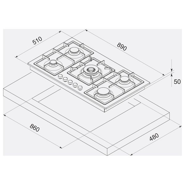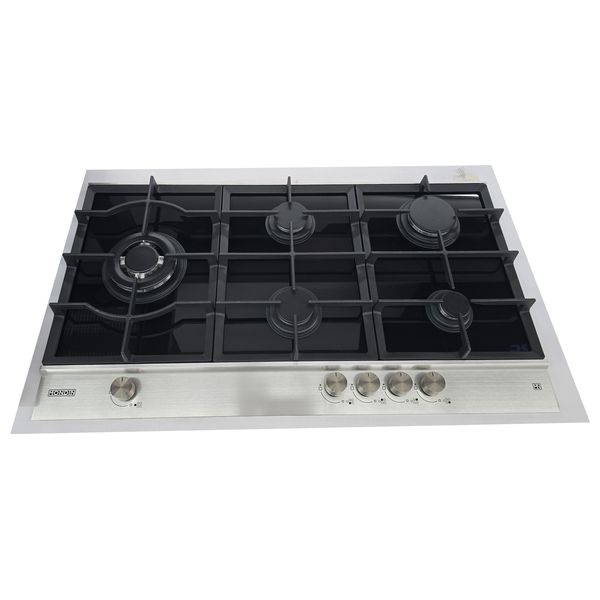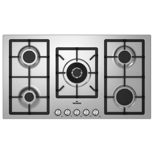 طباخ غاز مدمج من موندين بخمسة عيون وسطح زجاجي أسود مقاوم للحرارة. صناعة إيطالية مع إشعال كهربائي ونظام أمان على جميع المشاعل لضمان أداء موثوق في المطابخ العراقية اليومية. شبكات متينة ومظهر أنيق يسهل التنظيف ويعزز المتانة.