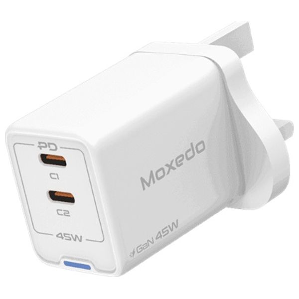 شاحن GaN مدمج يعتمد تقنية Power Delivery بإخراج 45 وات عبر منفذين USB-C. يتميز بتقنية GaN لإدارة الطاقة بكفاءة مع مؤشر LED واضح عند التوصيل. يدعم الشحن المتزامن للهواتف والأجهزة اللوحية وأجهزة الكمبيوتر المحمولة مثل ماكبوك وثينك باد، إضافة إلى هواتف iPhone 13/14/15 Pro Max وSamsung وHuawei وVivo. أبعاده 15 × 9.5 × 5.3 سم ووزنه 133 جرام، مما يجعل استخدامه مريحاً في المنزل أو المكتب أو أثناء التنقل.