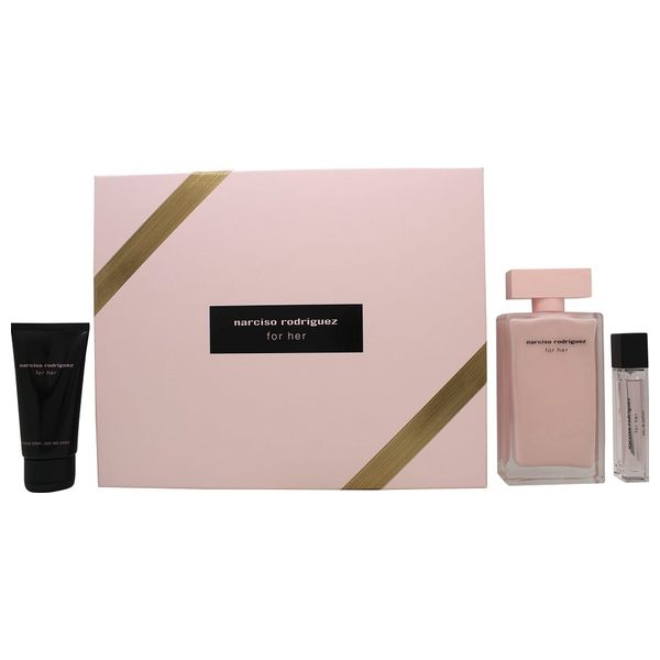 مجموعة الهدايا الرائعة وجذابة للنساء تتكون من 3 قطع, عطر زهري فواح نارسيسو رودريغيز فورهير او دي بارفيوم بحجمين 100 مل و 10 مل, مع لوشن الجسم بحجم 50 مل.