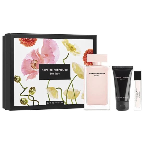 مجموعة الهدايا للنساء بعلبة انيقة مزخرفة بالورود وبرائحة عطرية من الازهار, الخشب والمسك, تتضمن المجموعة: عطر نرسيسو رودريغيز اودي بارفيوم بحجمين 100 مل و10 مل, لوشن الجسم 50 مل.
