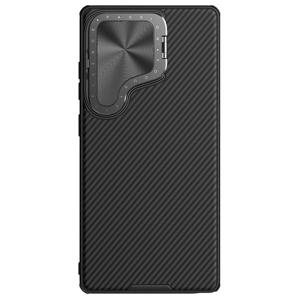 كفر نيلكن CamShield Prop لهاتف Samsung Galaxy S25 Ultra باللون الأسود يحتوي على غطاء عدسة CD لامع قابل للطي يعمل أيضًا كحامل للهاتف. السطح مطلي بزيت لمسي لراحة اليد ويمنع بصمات الأصابع وبقع الزيت. يحتوي على وسائد هوائية في الزوايا الأربع لمقاومة الصدمات.