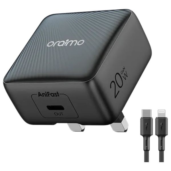 شاحن جداري أورايمو - قوة 20W - تقنية AniFast - كيبل يو اس بي سي إلى لايتينغ - 1 متر - اسود