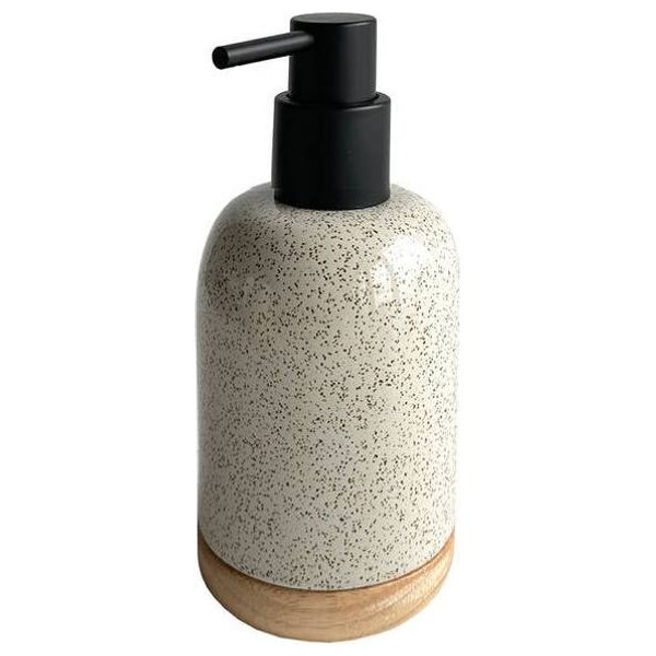 موزع صابون سائل Cartri من Primanova بجسم سيراميكي بيج مع نقوش، مضخة سوداء وقاعدة خشبية، مناسب للصابون السائل، سهل الاستخدام وإعادة التعبئة