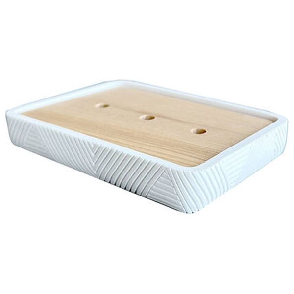 طبق صابون Primanova Madeira مستطيل أبيض مع قاعدة خشبية داخلية، يحافظ على جفاف الصابون ويرتب الحوض