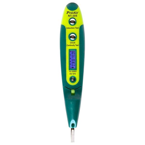 جهاز فحص فولتية بالتلامس من بروسكيت NT-305 أداة مدمجة للاختبار السريع لوجود الكهرباء واختبار الاستمرارية في الدوائر. يغطي النطاق 12-250 فولت تيار متردد/مستمر، ويتيح اختبار التحفيز للكشف بالتلامس بشكل آمن. حجمه الصغير ولونه الأخضر يجعل حمله واستخدامه سهلاً في الأعمال الكهربائية المنزلية والمهنية بالعراق.