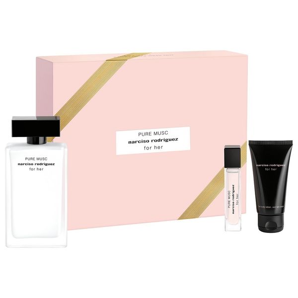 مجموعة الهدايا الفاخرة بعلبة انيقة للنساء مكونة من ثلاث قطع, عطر جذاب منعش نارسيسو بور مسك فورهير او دي بارفيوم بحجمين 100 مل و 10 مل, مع لوشن الجسم المعطر بحجم 50 مل.