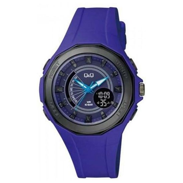 ساعة نسائية بعقارب بلون أزرق مع علبة من ستانلس ستيل وحزام مطاطي، قطر 42 مم وسماكة 11 مم، مقاومة للماء حتى 100 متر، تعرض التاريخ عند الساعة 3، بإغلاق دبوس، وتعمل بحركة كوارتز