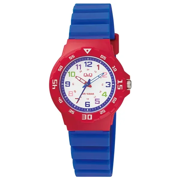 ساعة أطفال أنيقة وعملية بمينا دائري أبيض وسوار أزرق من مادة الريزن المتينة مع عرض تماثلي وزجاج أكريليك مقاوم للخدوش. تتميز بحجم هيكل 33 ملم وسمك 9.7 ملم، وقفل إبزيم آمن. مقاومة للماء حتى 10 بار.