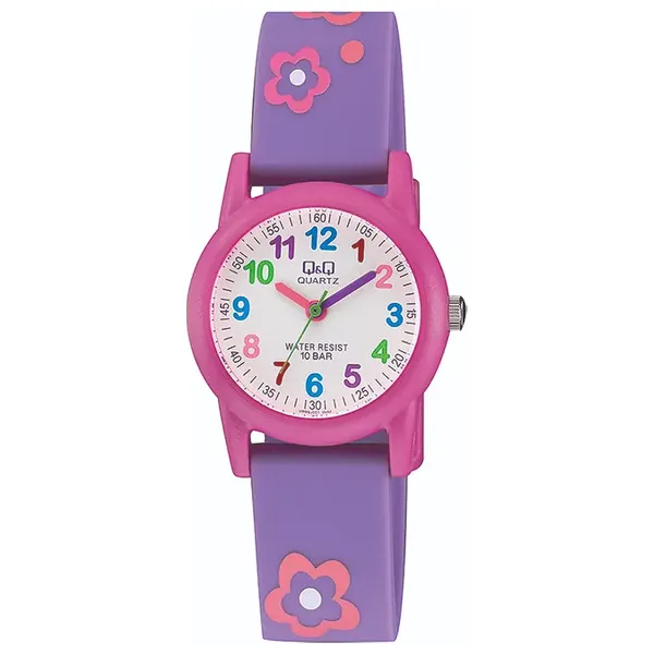 ساعة أطفال بمينا أبيض وهيكل دائري بنفسجي من الريزن، قطر 30 ملم وسمك 9.7 ملم، زجاج أكريليك، سوار من الريزن بعرض 16 ملم وطول 189 ملم مع إبزيم تقليدي، وزنها 19 جرام، مقاومة للماء حتى 10 بار، وتعمل بحركة كوارتز Cal.2035.