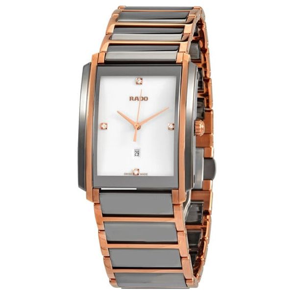 تصميم مستطيل من السيراميك الرمادي عالي التقنية مع لمسات ذهب وردي، تتميز بميناء أبيض أنيق مرصّع بـ ألماس عند مؤشرات 3، 6، 9 و12، وعقارب بلون الذهب الوردي، تعمل بآلية كوارتز سويسرية دقيقة وتعرض التاريخ عند الساعة 6. زجاج ياقوت مقاوم للخدش، وسوار يجمع بين الفولاذ المقاوم للصدأ والسيراميك الرمادي مع مشبك آمن. مقاومة للماء حتى 30 مترًا