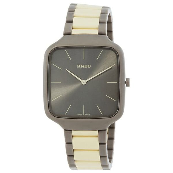 ساعة رادو بعلبة سيراميك عالي التقنية 37 مم وميناء رمادي بني طبيعي مشمس مع عقارب ومؤشرات باللون الكريمي الأبيض، تعمل بحركة كوارتز R420 دقيقة، مع سوار سيراميك عالي التقنية، وزجاج ياقوت مسطح وتصميم مونو-بلوك متين، الوزن: 86 غم