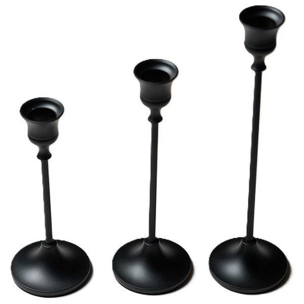 طقم حوامل الشموع الثلاثية المصنوع من معدن أسود مطفي. يأتي الطقم بثلاثة ارتفاعات مختلفة (16 سم، 20 سم، 23 سم) لإضفاء تباين بصري ديناميكي، مع قاعدة عريضة تضمن الثبات للشموع الطويلة
