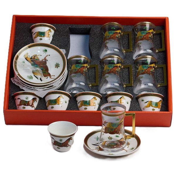 طقم شاي وقهوة عربي فاخر مكوّن من 18 قطعة (6 أستكانات زجاجية، 6 صحون، 6 فناجين بورسلين) مناسب لـ 6 أشخاص. يتميز الطقم بنقش الخيل العربي الذهبي الدقيق، ما يضفي لمسة ملكية وفاخرة على أي مناسبة. مصنوع من بورسلين وزجاج عالي الجودة لضمان المتانة ولمعان دائم