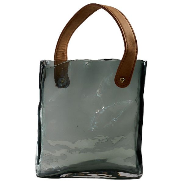 مزهرية بتصميم مبتكر يحاكي شكل حقيبة يد عصرية، مصنوعة من زجاج دخاني رمادي أنيق مع مقبض بني فاخر مثبت بتفاصيل معدنية ذهبية أو نحاسية، مثالية لعرض باقات الزهور الصغيرة أو النباتات العصارية، ويمكن استخدامها كقطعة ديكور قائمة بذاتها