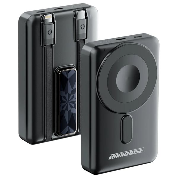 باور بانك مغناطيسي بسعة 10000 ملّي أمبير متوافق مع MagSafe وApple Watch، مزوّد بكابلات شحن سريعة 20 واط، ويدعم الشحن اللاسلكي مع تصميم محمول وأنيق.