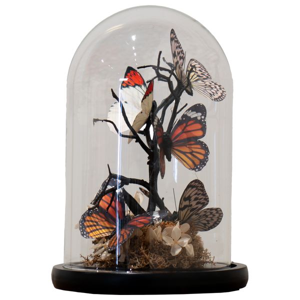 عرض فراشات أنيق يعرض فراشات محفوظة مرتبة على مجثّم فروع طبيعي داخل قبة زجاجية شفافة. المقاس ٤٥×٤٥×٣٣ سم ويستقر على قاعدة معدنية سوداء. مصمم من المعدن والزجاج، يجمع بين الجمال الطبيعي والتصميم العصري ليكون قطعة ديكور مذهلة لغرف المعيشة والدراسة والرفوف.