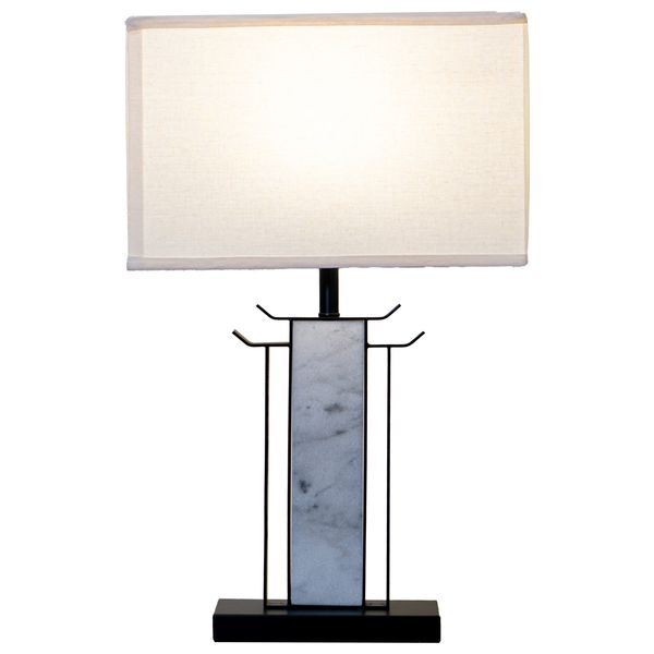 مصباح طاولة صدف بتصميم أنيق يجمع بين عمود من الرخام الإسباني وإطار معدني مع غطاء قماشي. بأبعاده 400 × 640 مم