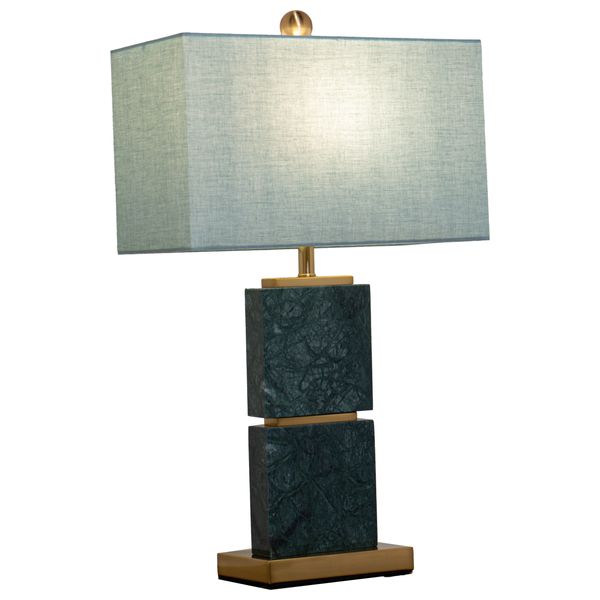 مصباح طاولة صدف بقاعدة رخام أخضر ولمسات معدنية ذهبية وظل قماشي رمادي فاتح. الأبعاد 400×680 مم، يوفر إضاءة أنيقة ومتانة عالية، مثالي لغرف المعيشة، النوم، والمكاتب