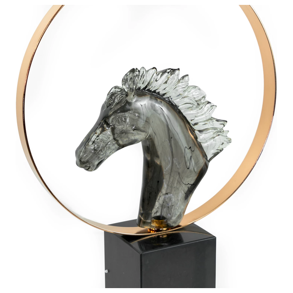 يجمع بين التصميم المعاصر والمواد الكلاسيكية، برأس من الراتنج الزجاجي الدخاني محاط بحلقة نحاسية مصقولة، ومثبت على قاعدة رخامية سوداء مربعة