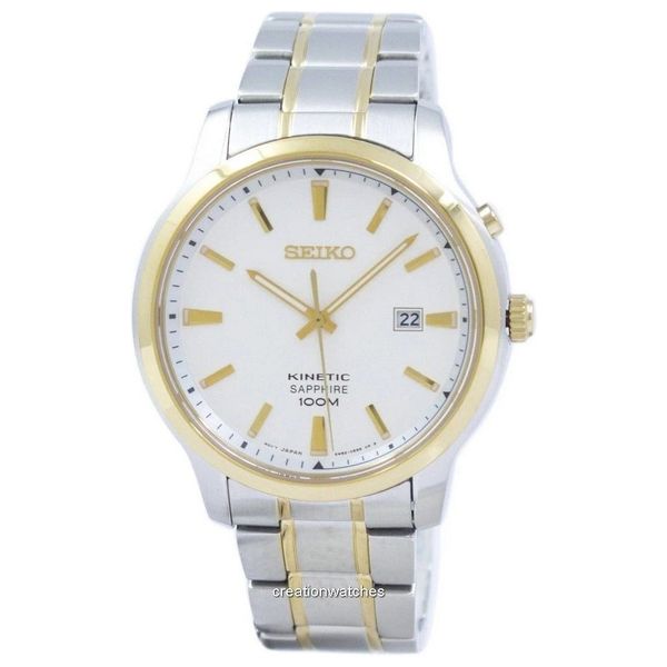 ساعة أنيقة مصنوعة من الفولاذ المقاوم للصدأ مع سوار ثنائي اللون، تعمل بحركة كينتيك، مزودة بقرص أبيض، عقارب وعلامات مضيئة، عرض للتاريخ، زجاج كريستال ياقوتي، ظهر شفاف، وإغلاق بنظام الطي، مقاومة للماء حتى 100 متر، بقطر حوالي 40مم وسمك 11مم