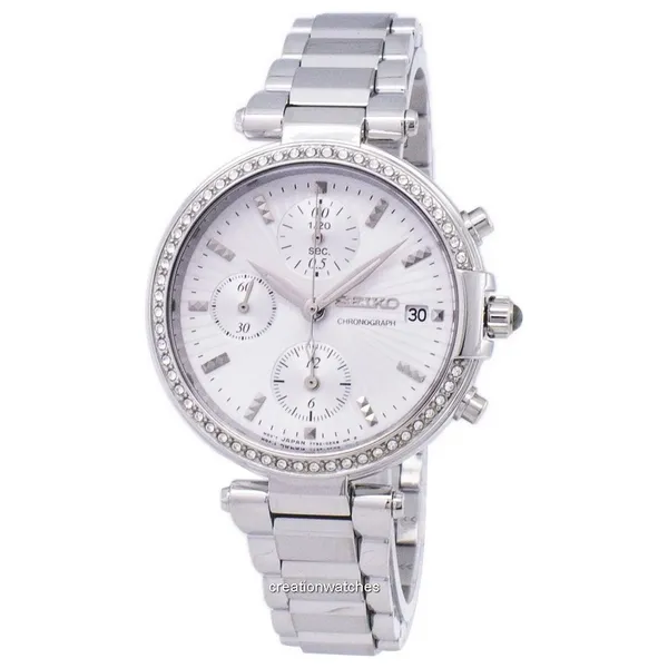 أنيقة مصنوعة من الفولاذ المقاوم للصدأ مع سوار فولاذي، تعمل بحركة كوارتز، بقرص فضي/أبيض وعرض تناظري، مزودة بوظيفة الكرونوغراف، عرض للتاريخ، ولمسات من كريستال سواروفسكي، بغطاء خلفي صلب وإغلاق بنظام الطي، مقاومة للماء حتى 30 متر، بحجم 36مم وسمك 10مم