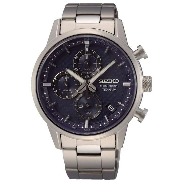 ساعة كرونوغراف رجالية بهيكل وسوار من التيتانيوم خفيف الوزن، تعمل بحركة كوارتز دقيقة ±15 ثانية شهريًا، مزودة بعرض التاريخ عند الساعة الرابعة وكرونوغراف حتى 12 ساعة بدقة ربع ثانية. الميناء الأزرق محمي بزجاج هاردلكس منحني مع عقارب وعلامات LumiBrite، مقاومة للماء حتى 10 بار، بغطاء خلفي لولبي وسوار بإغلاق ثلاثي الطي مع زر ضغط. الأبعاد: قطر العلبة 41.6 مم، السمك 14.2 مم، طول من العروة للعروة 49.1 مم، عرض العروة 20 مم