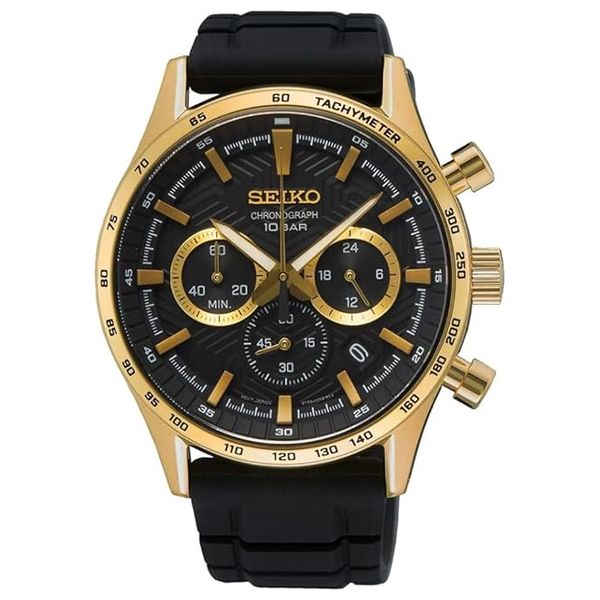 ساعة سيكو كرونوغراف بحركة كوارتز بدقة ±15 ثانية شهريًا وعمر بطارية حوالي 3 سنوات، مزودة بعقرب 24 ساعة، عقرب ثانوي صغير، كرونوغراف حتى 60 دقيقة وعرض التاريخ. العلبة من الفولاذ المقاوم للصدأ مع زجاج سافاير، عقارب وعلامات LumiBrite، سوار سيليكون، مقاومة للماء حتى 10 بار، بقطر 43 مم وسماكة 11.6 مم، طول من الأذن للأذن 50.4 مم، عرض بين الأذنين 22 مم، ووزن 98 جرام، مع غطاء خلفي لولبي
