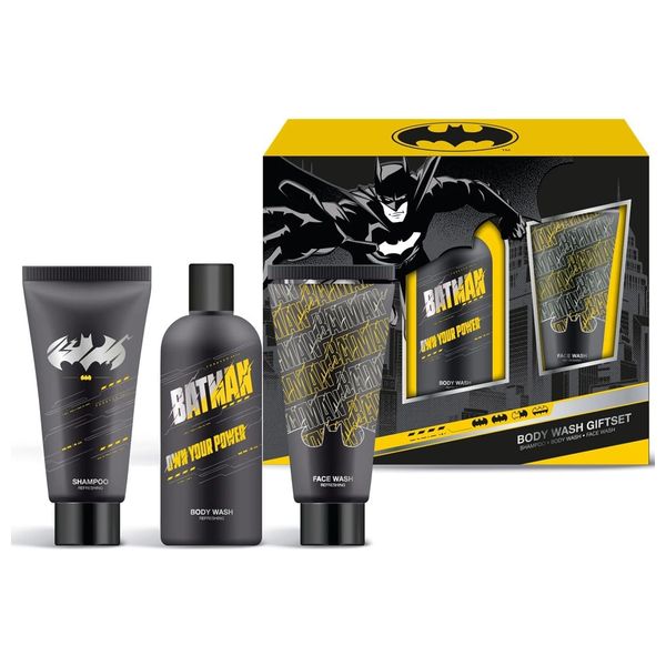 مجموعة عناية بالجسم مستوحاة من شخصية باتمان، تأتي بتصميم أنيق بلون رمادي داكن مع لمسات صفراء، تعكس أجواء مدينة غوثام وهوية البطل الخارق, تتضمن المجموعة: