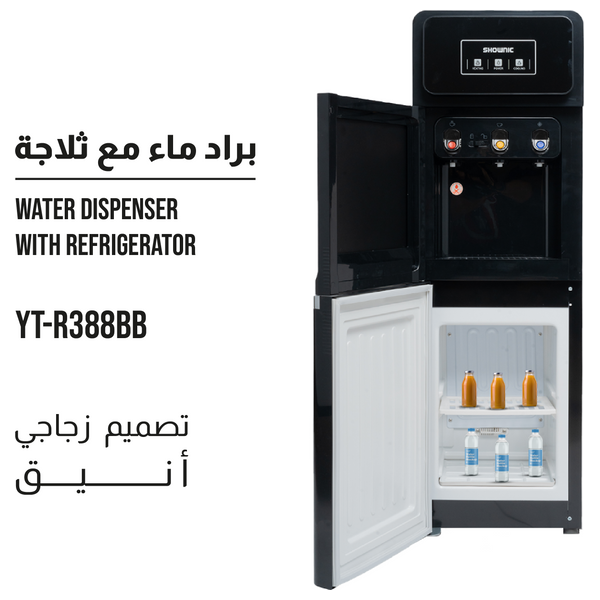 براد ماء شونك YT-R388BB تصميم عمودي مع ثلاجة مدمجة. يوفر ثلاث صنابير للماء الحار والبارد والمعتدل، حوض ماء من الستانلس ستيل، واجهة زجاجية، وقفل أمان للأطفال على صنب الماء الساخن. كما توجد حماية مزدوجة عند انخفاض مستوى الماء وبُعد مضغوط 330 × 330 × 1060 مم بلون أسود.