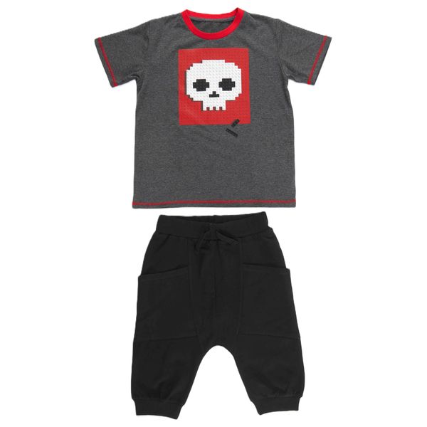 طقم للأولاد من قطعتين. تيشيرت من قطن الجيرسي بطبعة جمجمة. يكتمل الطقم ببنطال كابري قطني بنمط حريم. يحتوي على جيبين جانبيين. خصر مطاطي وأربطة. جميع منتجات دينوكيدس مصنعة وفقًا لإرشادات سلامة الأطفال. تم فحصها بواسطة أجهزة كشف المعادن. الخامة: الجزء العلوي: 65% قطن، 30% بوليستر، 5% إيلاستين - الجزء السفلي: 95% قطن، 5% إيلاستين. يُغسل على درجة حرارة 30 مئوية في درجة حرارة WM. يُغسل عكسيًا مع ألوان مماثلة. لا تستخدم المبيضات. لا تستخدم التنظيف الجاف. لا تستخدم المجفف.