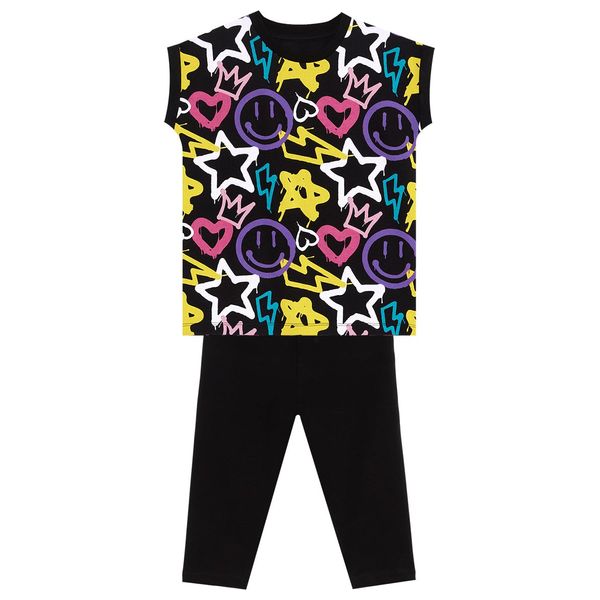 طقم بناتي من قطعتين. قطن جيرسي، تي شيرت أسود. عليه طبعة جرافيتي رذاذية. قطن جيرسي، مطاط، بنطال ضيق أسود. عليه طبعة قلب ونجمة. جميع منتجات MSHB&G مصنعة وفقًا لإرشادات سلامة الأطفال. خضعت للفحص بواسطة أجهزة كشف المعادن. الخامة: الجزء العلوي: ١٠٠٪ قطن، الجزء السفلي: ٩٥٪ قطن، ٥٪ إيلاستين. مدة الغسيل: يُغسل على درجة حرارة ٣٠ درجة مئوية في دورة WM. يُغسل عكسيًا مع ألوان مماثلة. لا تستخدم المبيضات. لا تستخدم التنظيف الجاف. لا تستخدم المجفف.