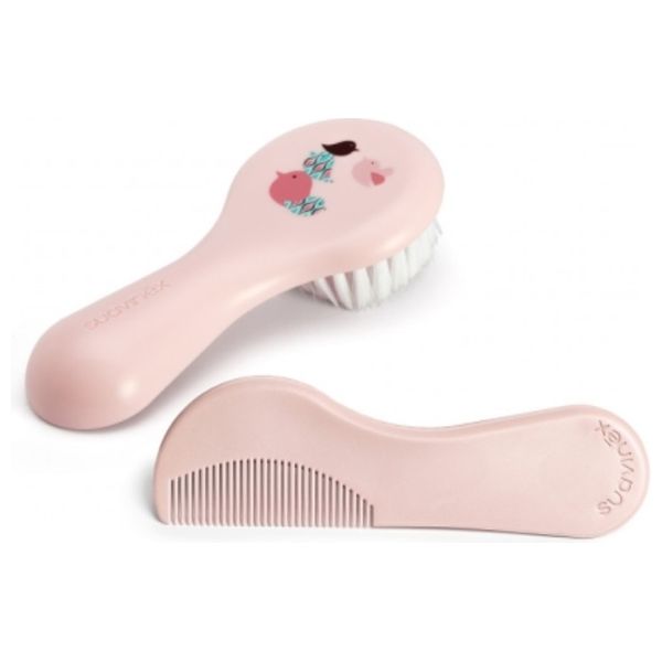 طقم فرشاة ومشط سوافنيكس مُصمم للعناية اليومية بالرضع بلطف. فرشاة ذات شعيرات ناعمة ومرنة لتنظيف فروة الرأس بدون إزعاج، والمشط بأسنان مستديرة لحماية شعر وبشرة الطفل الرقيقين. مقبضان مريحان لسهولة الاستعمال أثناء وقت الاستحمام والتسريح. اللون الوردي الفاتح يضيف لمسة جذابة، وهذا الطقم المدمج سهل الاستخدام والتنظيف، لذا فهو خيار عملي ضمن روتين العناية اليومي بالطفل.