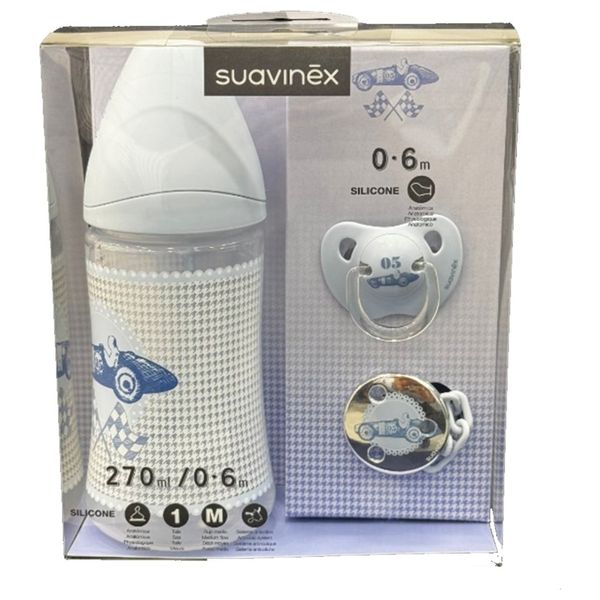 يحتوي طقم الرضاعة من سوافنيكس على زجاجة رضاعة ذات فوهة عريضة بحلمة سيليكون، ومشبك ديكوري، لهاية مهدئة. مخصص لرضع عمرهم من 0 إلى 6 شهور، يتميز بتصميم ممتع على شكل سيارة بلون أزرق أنيق، لضمان راحة وسلامة طفلك.