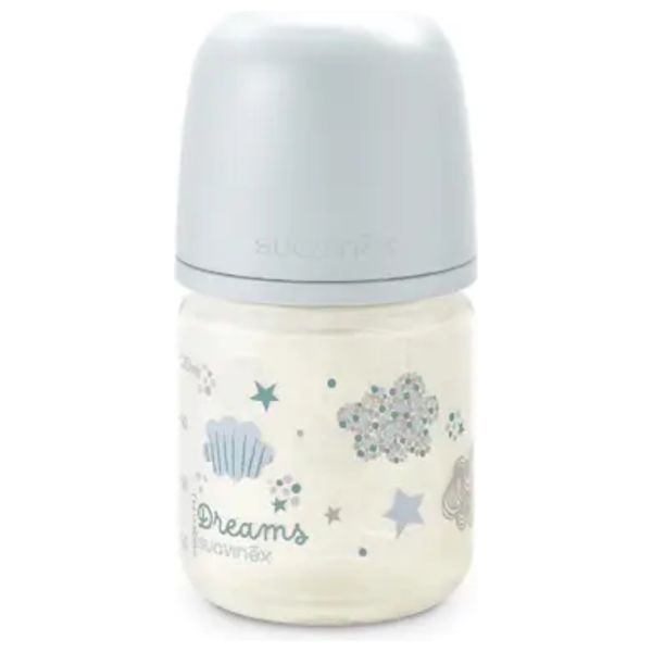 رضاعة Dreams من سوافنيكس بسعة 120 مل توفر حلاً بسيطاً وآمن للرضاعة. سهل التنظيف ويسمح بمراقبة تدفق الحليب، مع تصميم DREAMS الأزرق الجذاب الذي يروق للوالدين والرضع.