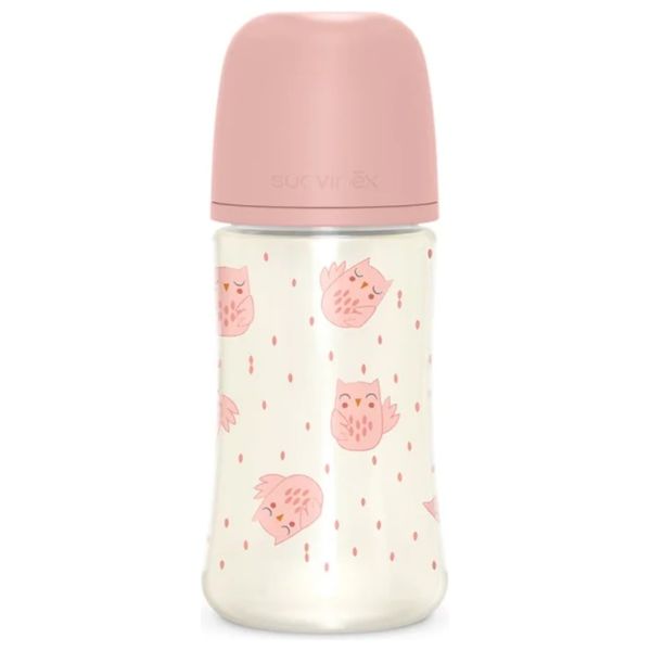 رضاعة من سوافنيكس سعتها 270 مل وردي توفر رضاعة آمنة ومريحة بوجود جسد خالٍ من BPA وحلمة سيليكونية بتدفق بطيء وصمامات مضادة للمغص. يسهّل العنق العريض والحلمة المستديرة الإرضاع بشكل طبيعي، بينما يضيف نمط البومة الوردي لمسة جذابة. مناسبة من الولادة؛ آمنة للغلي لتعقيمها.