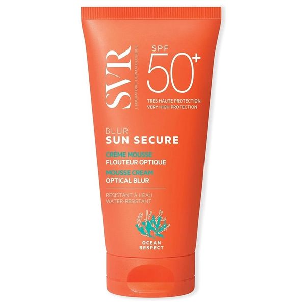 واقِي شمس SVR Sun Secure Blur SPF 50 بحماية عالية وبتكوين موس كريمي. مقاوم للماء والعرق، يذوب هذا الموس المعطر برائحة المشمش عند ملامسته للبشرة ويصبح غير مرئي، ويساعد في إخفاء العيوب وتنعيم وتوحيد لون البشرة ليمنحك مظهرًا مخمليًا.
