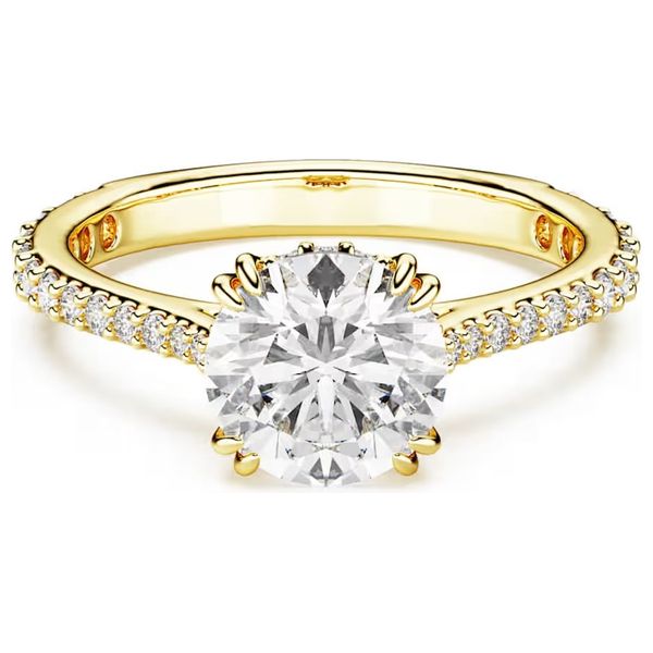 اكتشفي أناقة خاتم كوكتيل ستيلا من سواروفسكي، بحجر زركونيا دائري مذهل في وسطه، مرصع بأحجار باڤيه متلألئة، مصنوع من طلاء ذهبي أنيق، يضفي لمسة من الرقي على أي إطلالة، مثالي للمناسبات الخاصة أو الإطلالة اليومية الأنيقة