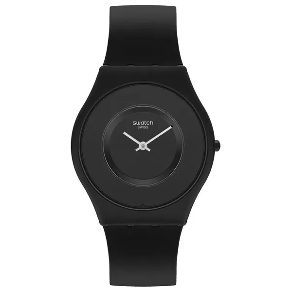 ساعة عصرية بميناء أسود وغطاء أكريلي، مع علبة صناعية بقطر 34 مم وسمك 4 مم. حركة كوارتز، مقاومة للماء حتى 30 مترًا، وسوار مطاطي باللون الأسود
